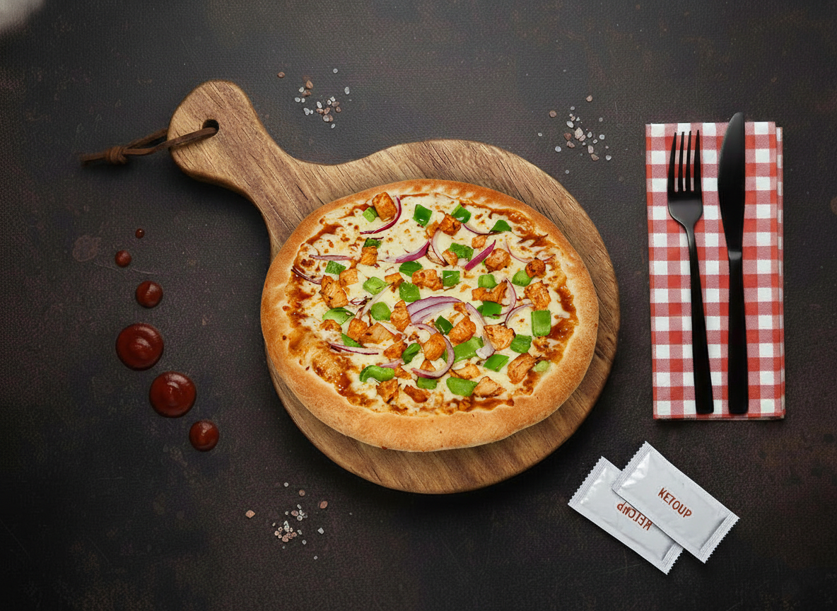 Samion’s BBQ Feast Pizza is packed with smoky flavors, juicy BBQ chicken, onions, peppers, and melted cheese on a crispy base. Each bite delivers a rich and satisfying taste.