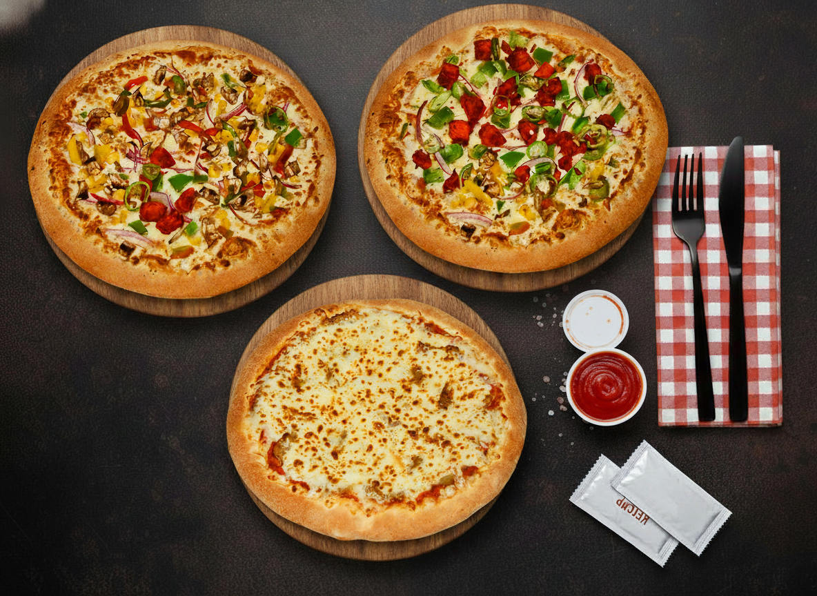 You can add extra toppings like Pepperoni, Spicy Chicken, Tandoori Chicken, Sweetcorn, Fresh Tomato, Pineapple, Prawns, Cheese, Donner, Chilli Seeds, BBQ Base, Onions, Red Onions, Jalapenos, Anchovies, Pickle Jalapeno, Black Peppers, Oregano, Ham, Sausage, Mushrooms, Mix Peppers, Olives, Tuna, and Green Chillies. This deal is perfect for family meals or gatherings, ensuring everyone gets their favorite pizza flavors in one delicious package.
