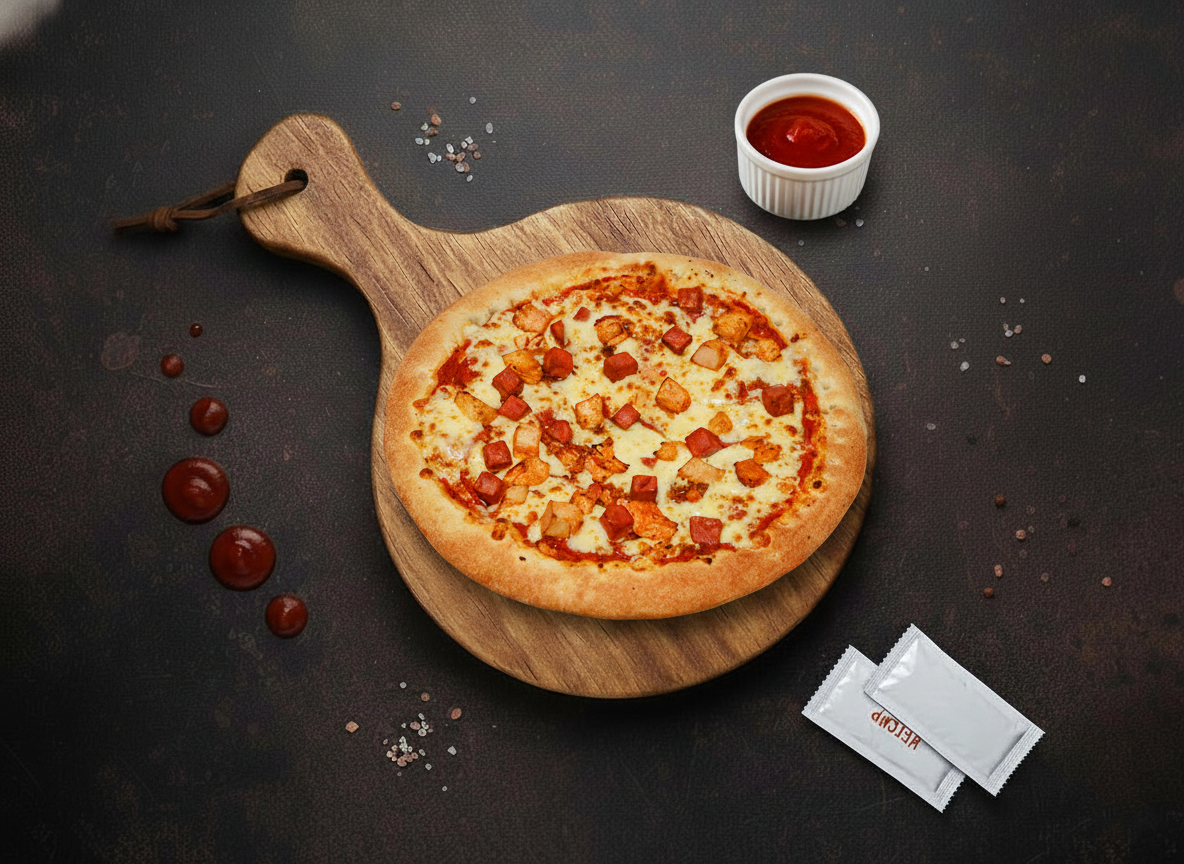 Samion’s Meat Feast Pizza is perfect for meat lovers. It starts with a soft pizza base, rich pizza sauce, and creamy melted cheese, then is generously topped with a hearty mix of spicy chicken, BBQ chicken, pepperoni, sausage, ham, and doner meat. This combination delivers a strong, juicy, and flavour-packed bite in every slice.